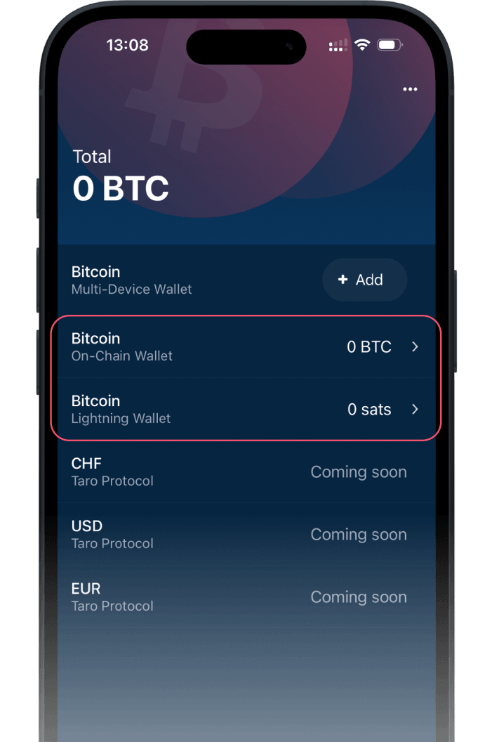 1Nach der Einrichtung der App wähle zwischen On-Chain- und Lightning-Wallet.