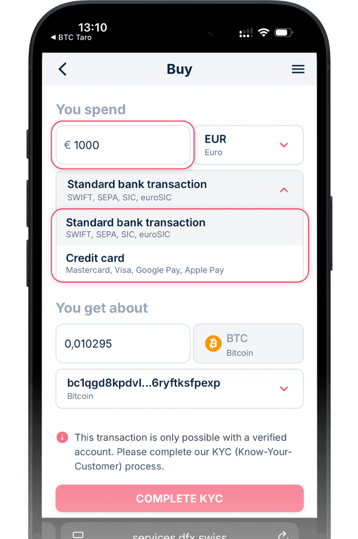 3Gib den Kaufbetrag in EUR oder CHF ein und wähle die Zahlungsmethode: Banküberweisung oder Kreditkarte (Visa, Mastercard, Google Pay, Apple Pay). Eventuell ist eine einmalige KYC-Verifizierung erforderlich.